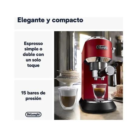 Cafetera Espresso Manual De’Longhi Dedica 15 Bares, 1300W. Calentamiento Thermoblock en 40 segundos. Diseño ultra-compacto (14.9 cm ancho). Incluye vaporizador y Calienta Tazas. Color Rojo.