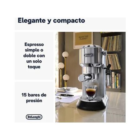 Cafetera Espresso Manual De’Longhi Dedica 15 Bares, 1300W. Calentamiento Thermoblock en 40 segundos. Diseño ultra-compacto (14.9 cm ancho). Incluye vaporizador manual y Calienta Tazas. Color Plata Metalizado.