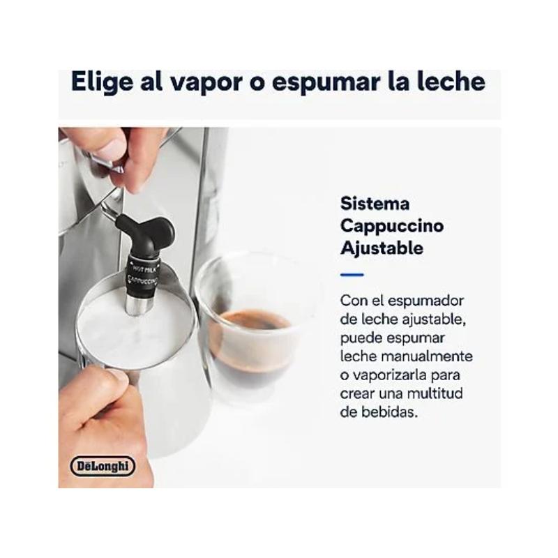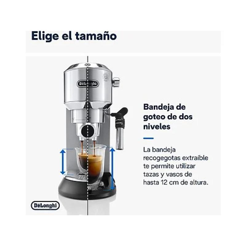 Cafetera Espresso Manual De’Longhi Dedica 15 Bares, 1300W. Calentamiento Thermoblock en 40 segundos. Diseño ultra-compacto (14.9 cm ancho). Incluye vaporizador manual y Calienta Tazas. Color Plata Metalizado.