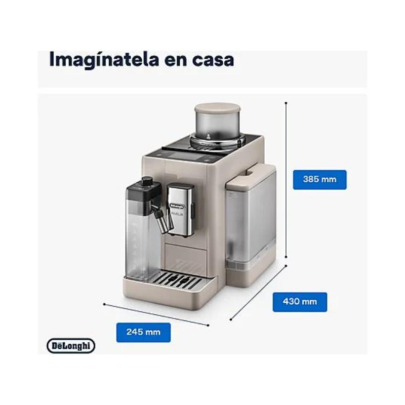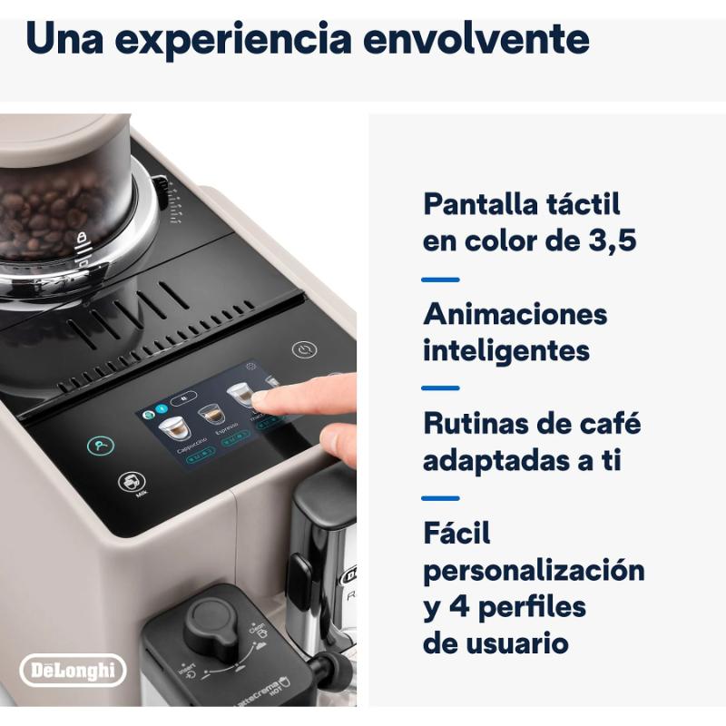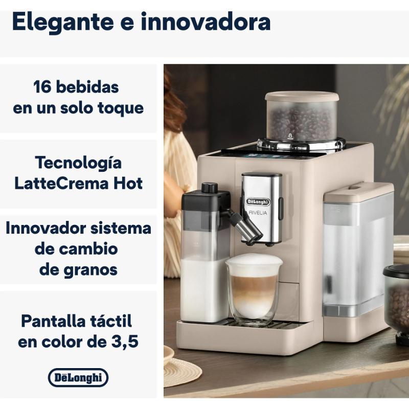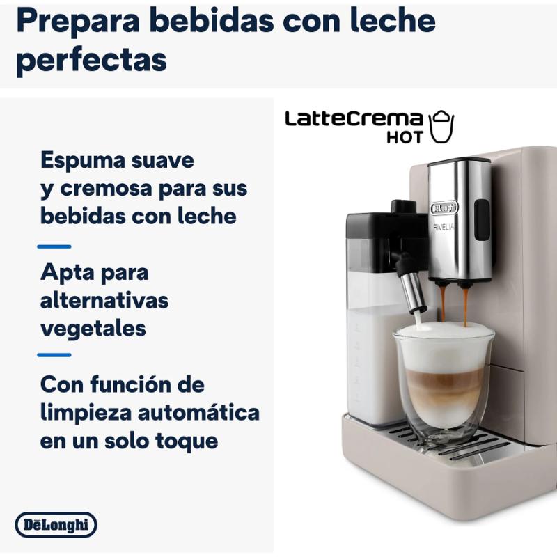 Cafetera De’Longhi Rivelia Superautomática 19 Bares, 1450W. Sistema de leche LatteCrema Hot con depósito automático. Molinillo integrado (Modo Switch), 16 recetas y Pantalla Táctil a color de 3.5″. Color Beige.