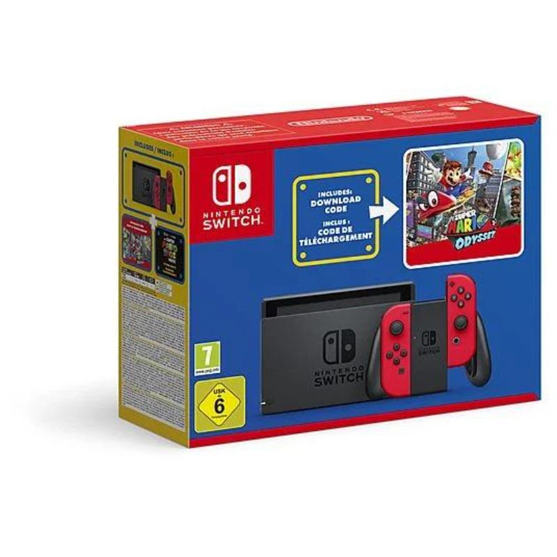 x1 Consola Nintendo Switch, x1 Joy-Con (L), x1 Joy-Con (R), x1 Base de Nintendo Switch, x1 Soporte para mandos Joy-Con, x1 Adaptador de corriente de Nintendo Switch, x1 Cable HDMI, Correas de los mandos, x1 Código de descarga para Super Mario Odyssey. |