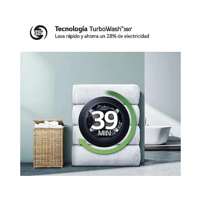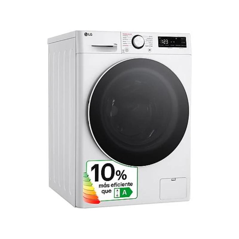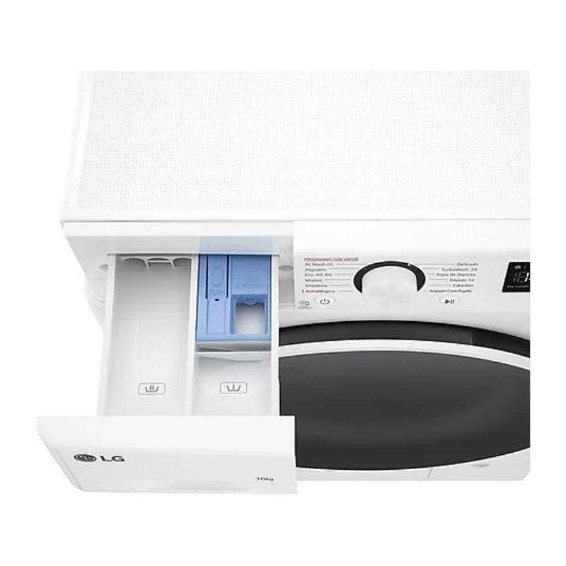 Lavadora LG Serie 600 de 10 kg, 1400 rpm. Doble Clase A (Energía y Centrifugado). Motor AI Direct Drive™ y tecnología TurboWash™360˚ (lavado completo en 39 min). Incluye función Antialérgico con vapor. Color Blanco.