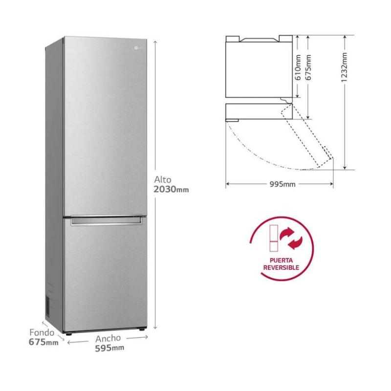 Frigorífico Combi LG, 203 cm, 381 L. Clase A (máxima eficiencia). Ultra silencioso (29 dB). Full No Frost Inverter, DoorCooling+, FreshConverter/Balancer. Inox con puertas reversibles.