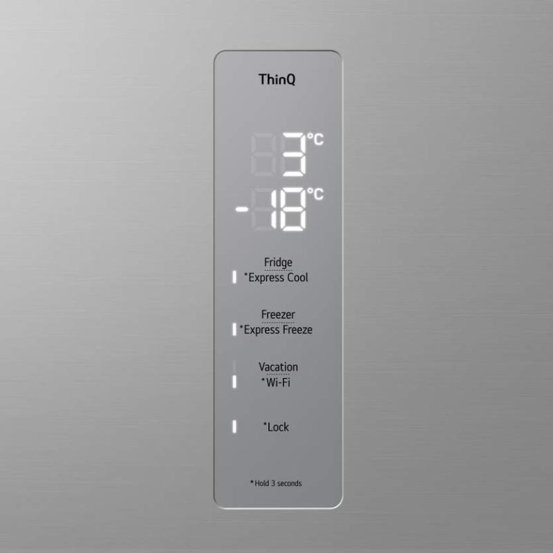 Smart & Diseño El control es táctil y se realiza mediante una pantalla LED integrada en la puerta. El frigorífico tiene conectividad Wi-Fi a través de la aplicación LG ThinQ, que permite el diagnóstico inteligente (Smart Diagnosis) y el control remoto. Dispone de puertas reversibles, función Super Cool y modo Vacaciones.