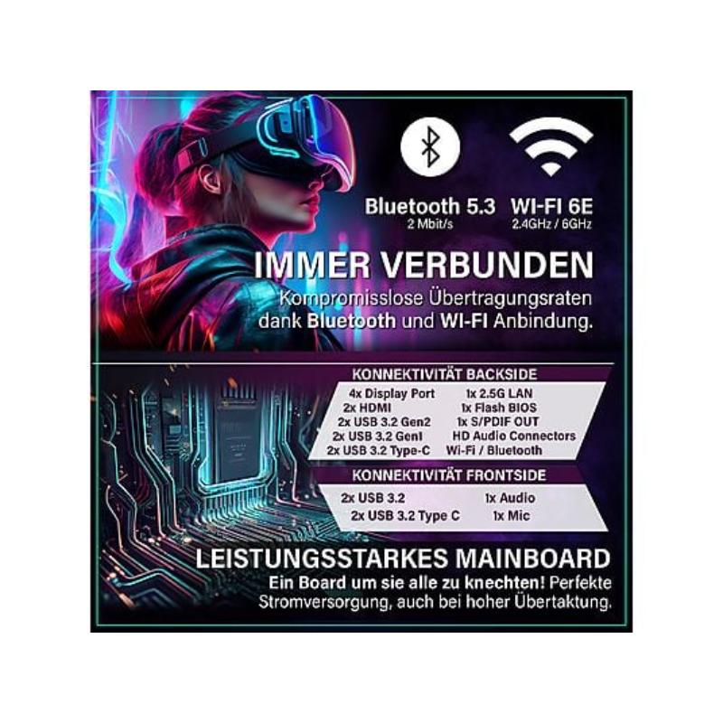 4x DisplayPort, 2x HDMI, 4x USB 2.0, 8x USB 3.2 Gen 1, 6x UBS 3.2 Gen 2, 2x USB 3.2 Type C, 1x LAN, 1x Audio, 1x Mikrofon |