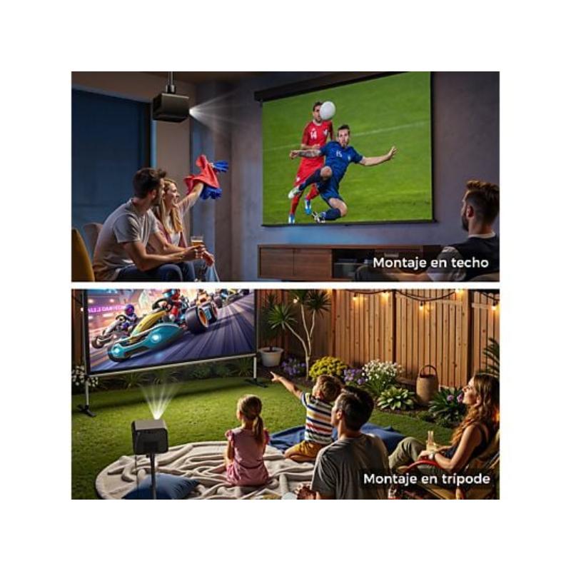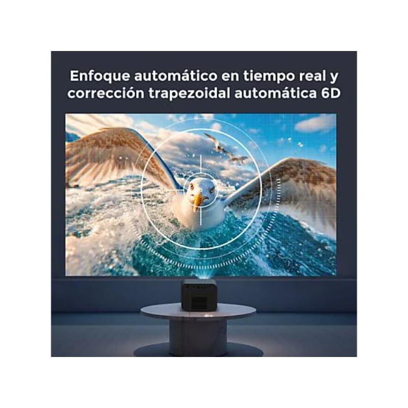 Proyector LCD con resolución nativa Full HD (1080P), 900 ANSI lúmenes y compatibilidad con decodificación 4K y HDR10. Cuenta con enfoque y corrección automáticos, altavoces de 30W y conectividad WiFi 6 y Bluetooth 5.3. Su lámpara LED ofrece una vida útil de 100,000 horas.