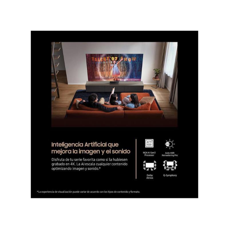 Equipado con el avanzado procesador NQ4 AI Gen3, este Smart TV utiliza 128 redes neuronales para escalar cualquier contenido a 4K con precisión, optimizando tanto la imagen como el sonido según el tipo de contenido y las condiciones del entorno.